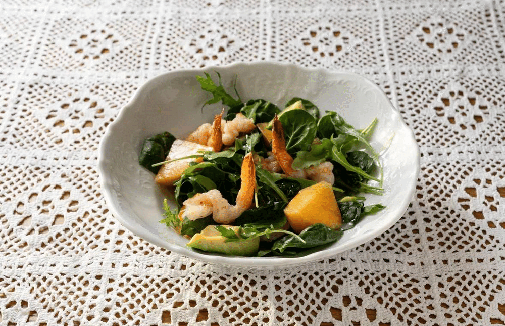 На подушку из шпината и руколы выкладываются обжаренные со специями креветки, спелая клубника, дополняется всё авокадо, микрозеленью и лаймовым дрессингом