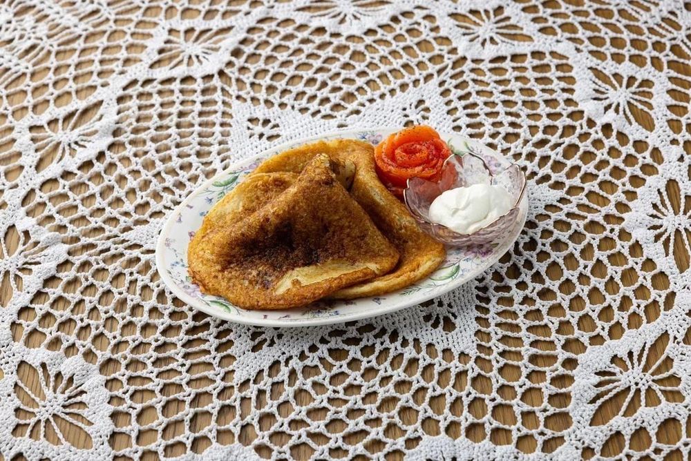 Пышные дрожжевые блины, по старорусскому рецепту, со слабосоленым лососем и копченой сметаной