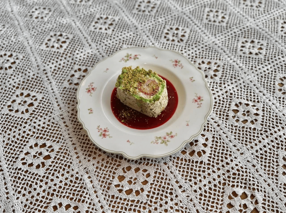 Лёгкий и воздушный десерт, классическое сочетание сезонной клубники и ароматной дробленой фисташки в основе которых, нежное креметте. Подложка из малиновго конфитюра