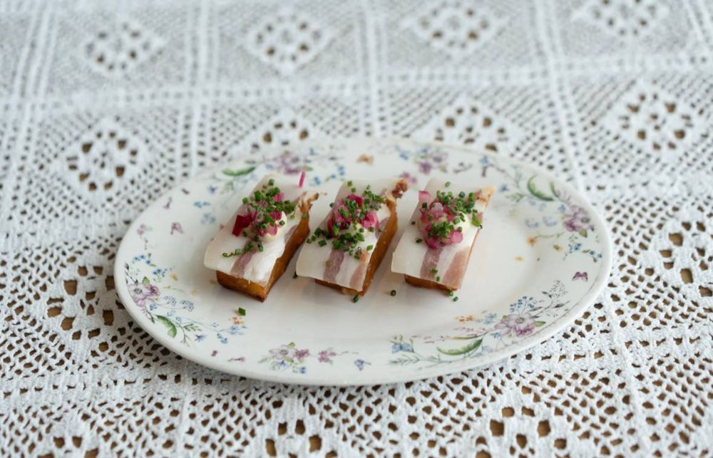 Легкая, яркая закуска из копченого сала и картофельного гратена, с чесночным айоли, свежим редисом и сибулетом