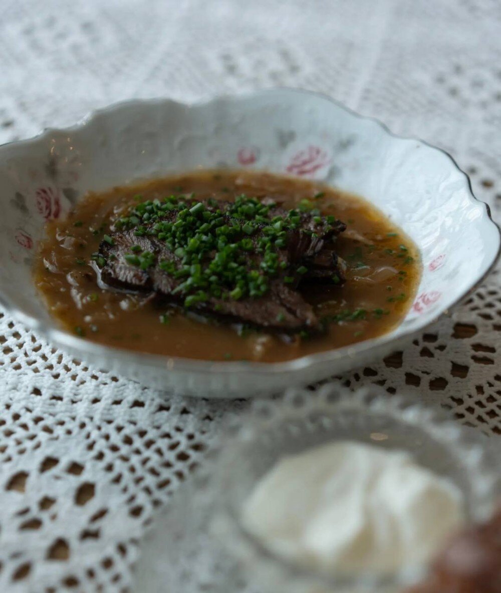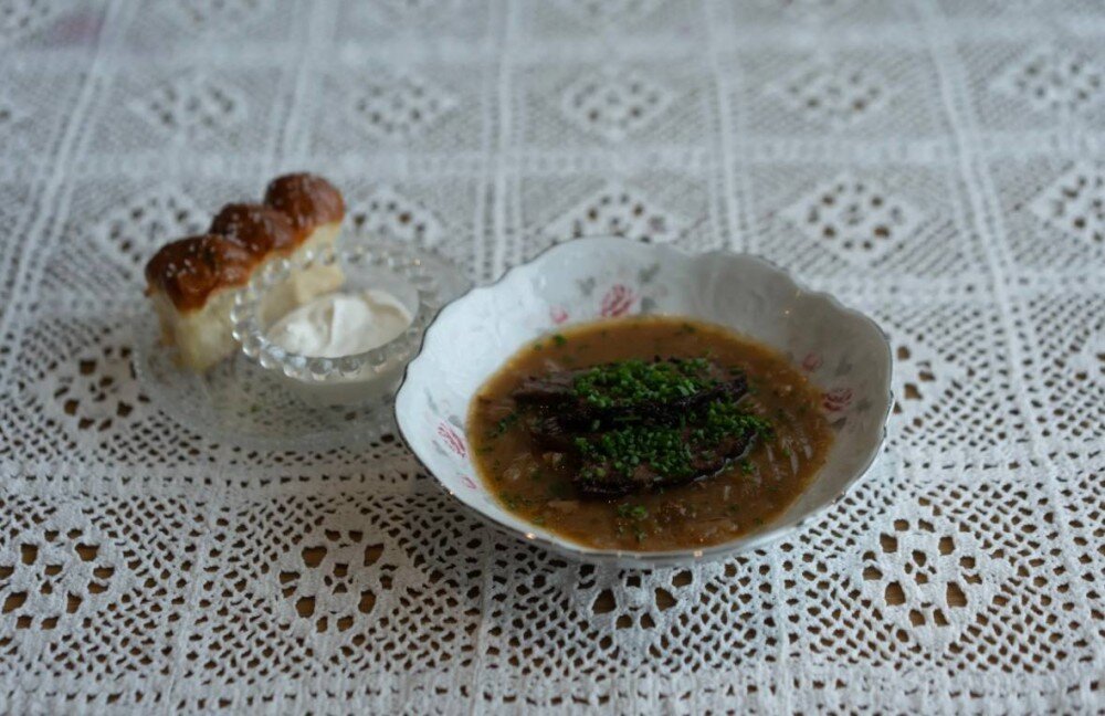 Суточные щи - это оригинальный вкус и неповторимое исполнение! Растомленные щи на основе овощей, лесных грибов и говяжьих щечек. Насыщенный овощной бульон, дополняется копченой сметаной.