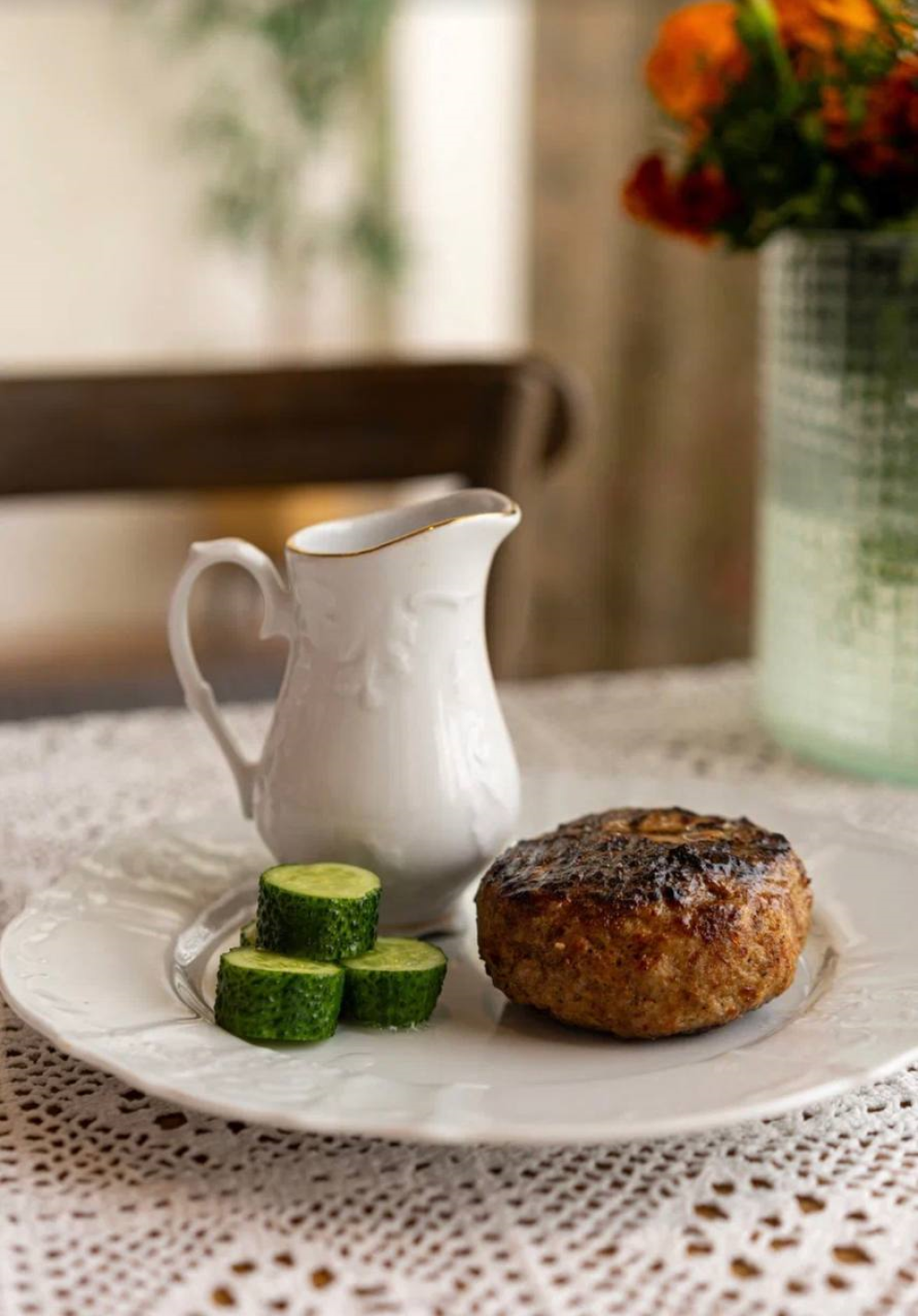 Сочный бифштекс из говядины, с ярким мясным соусом и малосольными огурцами, гарнируется домашним картофельным гратеном