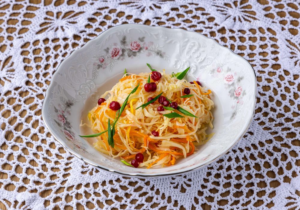 Домашняя квашеная капуста от маминых помощниц, заправленная ароматным маслом, с клюквой, маринованным луком и зеленью