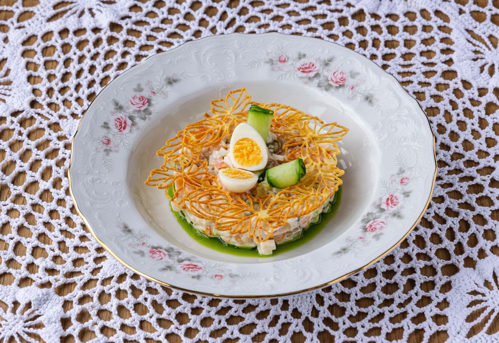 Традиционный салат "Оливье", с начинкой из телячьего языка и базовым составом из отварного картофеля, яиц, моркови, горошка, соленых и свежих огурцов, репчатого лука, заправлен майонезом